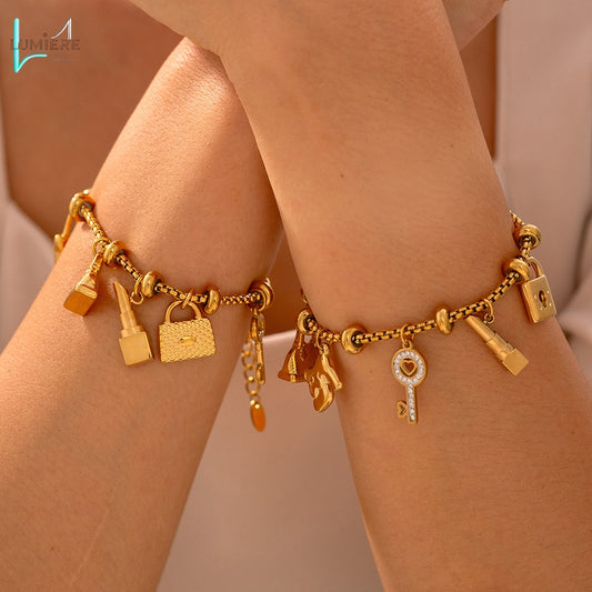 Titanium plated 18K gold multi-element hanging tag with diamond inlaid pendant bracelet