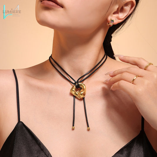 Titanium steel PVD coated 18k genuine gold leather rope adjustable necklace